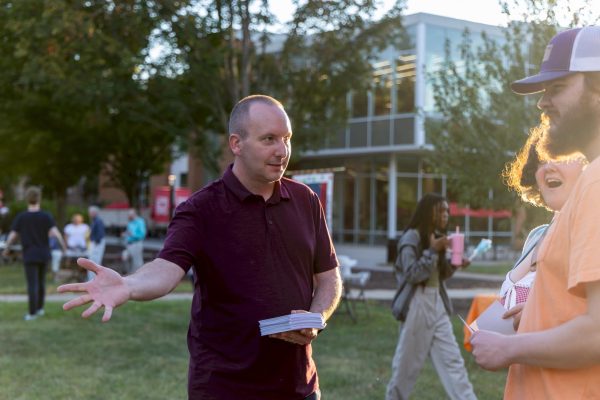Ben Erickson, faculty advisor for Alpha Phi Omega, talks to students at the Campus Connections Fair. Alpha Phi Omega is a service fraternity at Bridgewater.